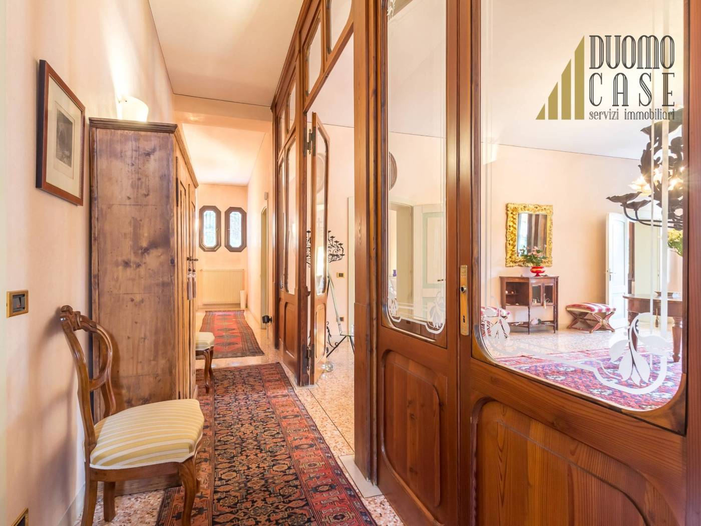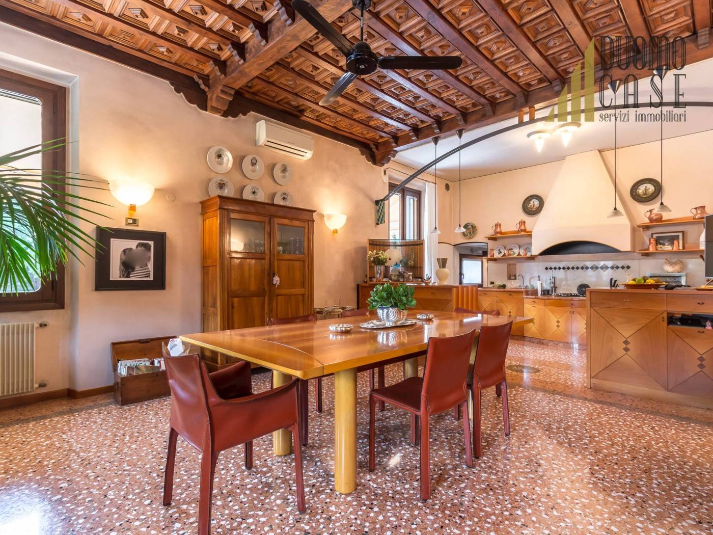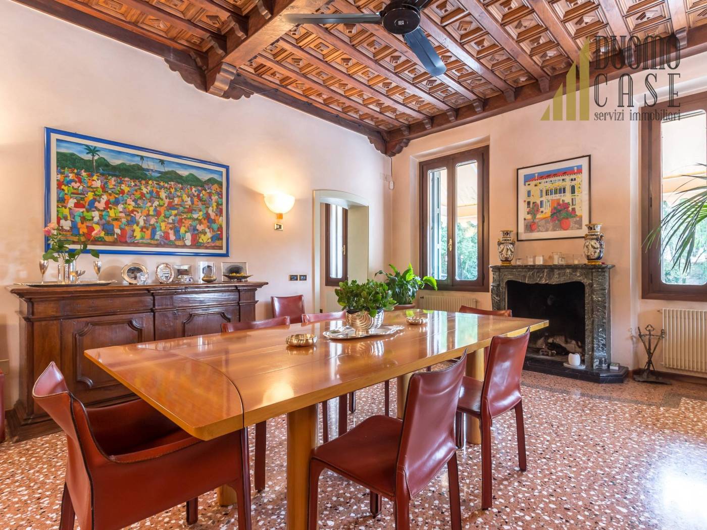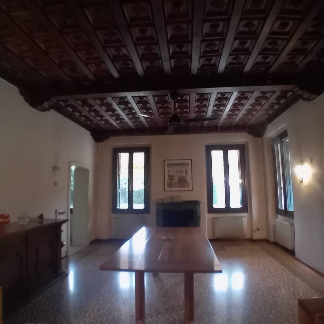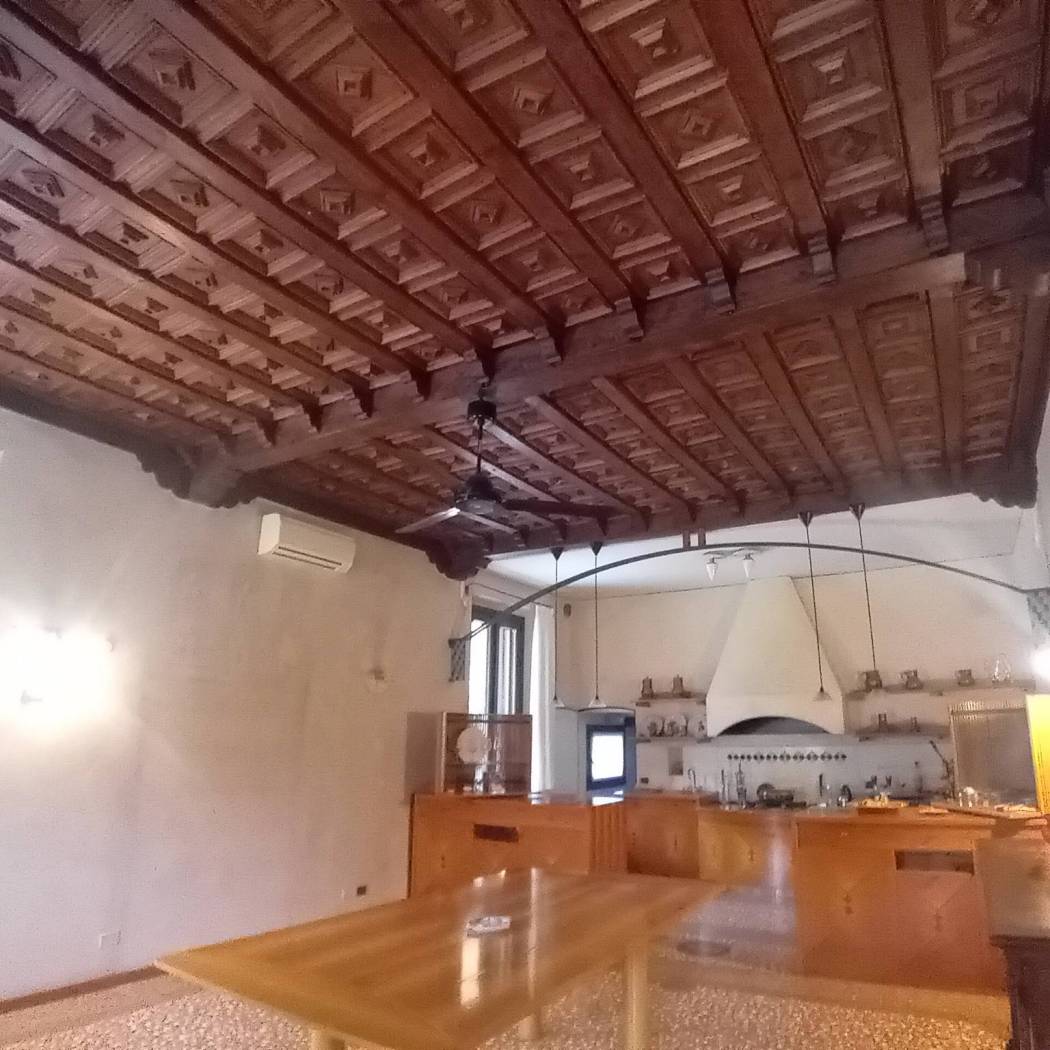 La pavimentazione è in un prezioso seminato alla veneziana, raffinati e pregiati soffitti a cassettoni.