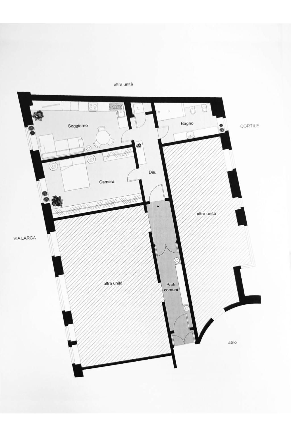 Duomo/Palazzo Reale/Via Larga In palazzo d'epoca signorile, al 1° piano alto, ottimo bilocale di mq 62 arredato e corredato con cura, molto luminoso. L'appartamento è composto da ingresso, soggiorno con cucina a vista, ampia camera con armadio su misura, bagno con finestra e grande doccia e ripostiglio con lavatrice/asciugatrice.