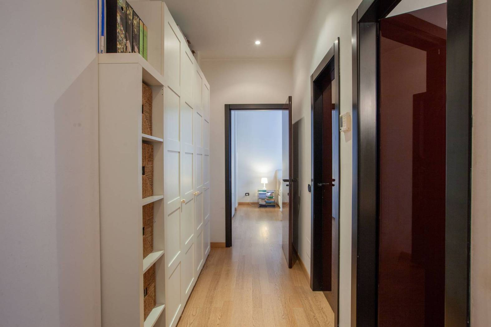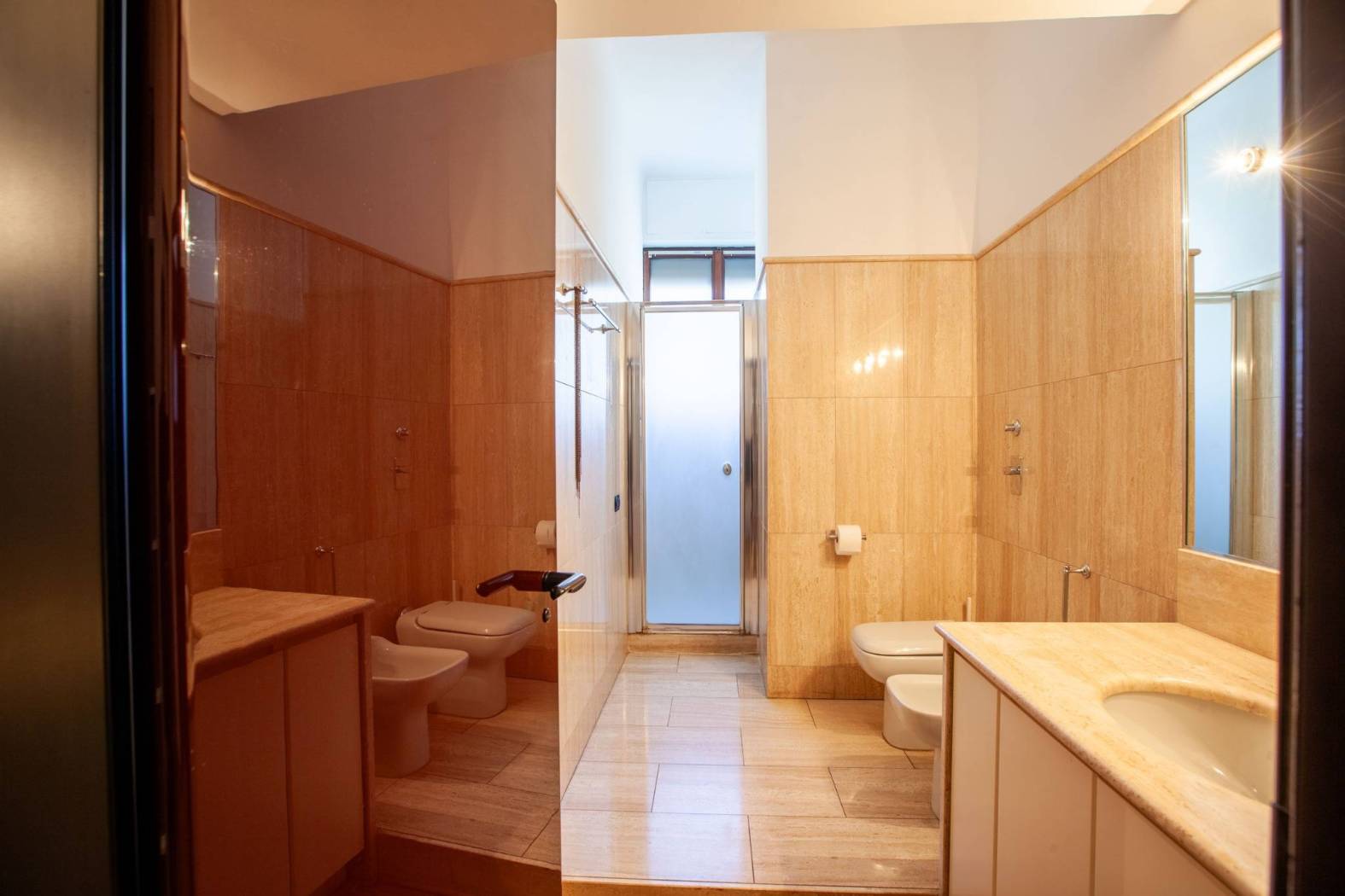 Disposizione: l'ingresso è ampio e aperto al soggiorno con zona pranzo e balconata. Cucina abitabile con arredi su misura di ottima fattura, ingresso di servizio. Le zone notte sono due: una all'ingresso con anticamera e due comode camere con armadi a muro, il grande bagno è in travertino beige caldo e lucido dove capeggia una importante vasca da bagno. L'ambientazione è calda e luminosa. Altra zona notte con camera padronale oltre a stanza guardaroba e bagno con doccia. anche questa zona è luminosa e silenziosa.